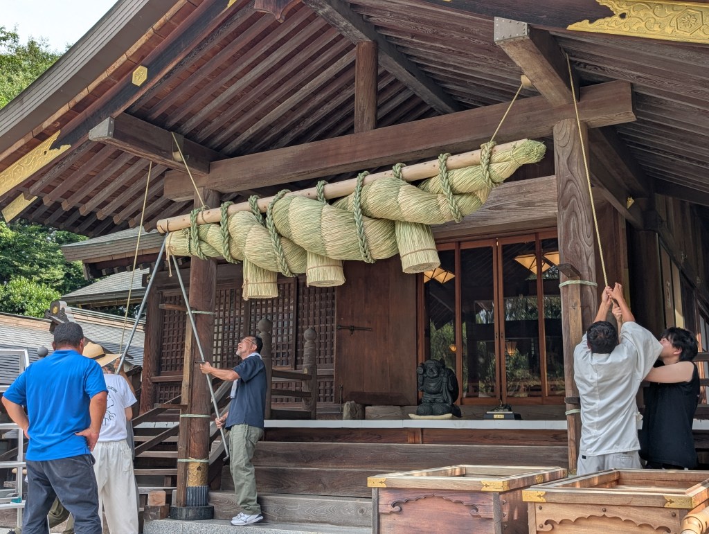 令和7年8月7日 島根県の大しめ縄創作館の手により奉製された特製の「大しめ縄」が、島根県飯南町からトラックで輸送され、出雲大社相模分祠社殿の大しめ縄の掛け替えが行われた。