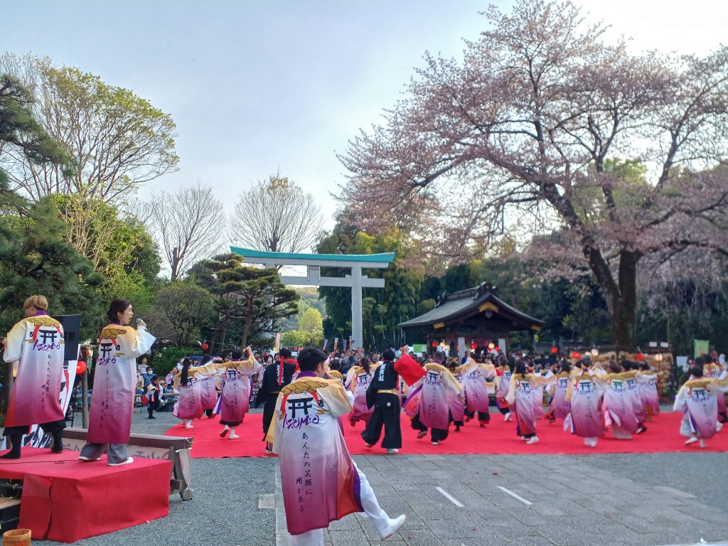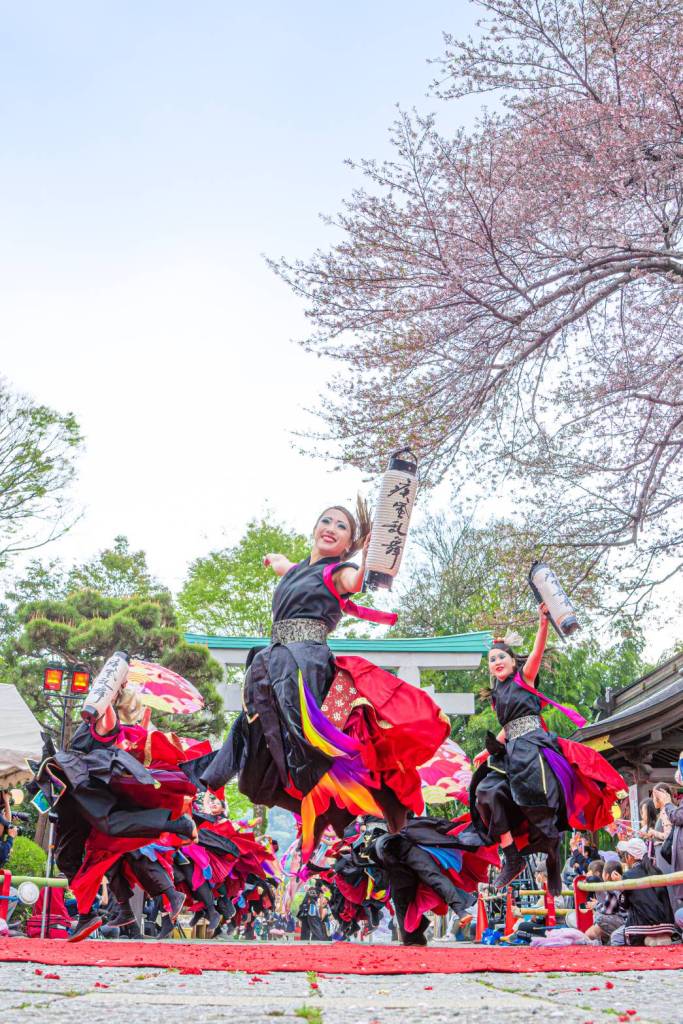 桜花爛漫、春の暖かさの中、鮮やかな衣装の舞手と露店も賑わい最高の盛り上がりを見せます。